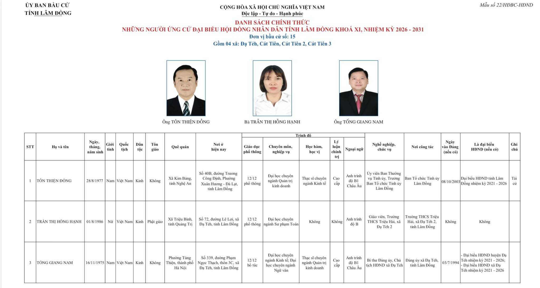 Tại kỳ bầu cử đại biểu Hội đồng nhân dân tỉnh Lâm Đồng khóa XI, nhiệm kỳ 2026 – 2031, đồng chí Tôn Thiện Đồng - Ủy viên Ban thường vụ Tỉnh ủy, Trưởng Ban tổ chức Tỉnh ủy Lâm Đồng cùng với 2 ứng cử viên ứng cử đại biểu HĐND tỉnh Lâm Đồng tại Đơn vị bầu cử số 15 (xã Cát Tiên, Cát Tiên 2, Cát Tiên 3 và Đạ Tẻh).