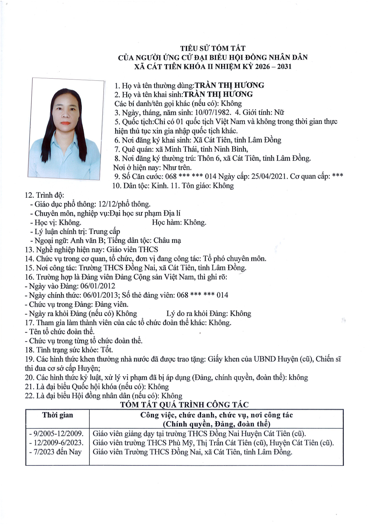 Chương trình hành động của Ứng cử viên ứng cử Đại biểu Hội đồng nhân xã Cát Tiên nhiệm kỳ 2026 - 2031 - đồng chí Lê Thị Tươi