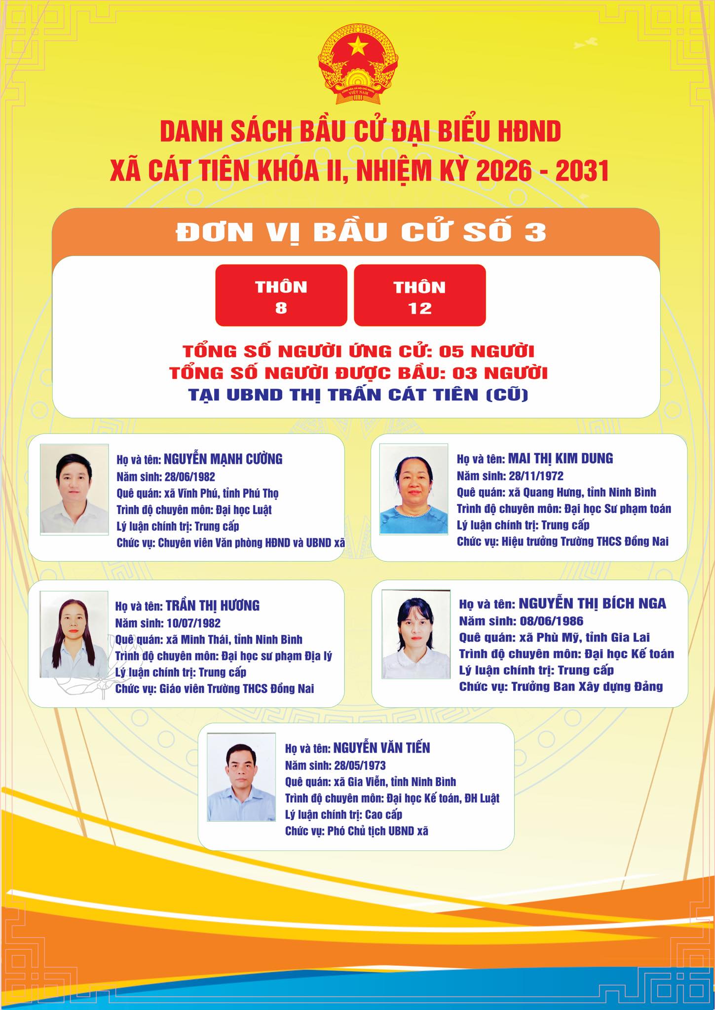 Danh sách chính thức những người ứng cử Đại biểu Hội đồng nhân dân xã Cát Tiên khoá II, nhiệm kỳ 2026-2031. Đơn vị bầu cử số 3